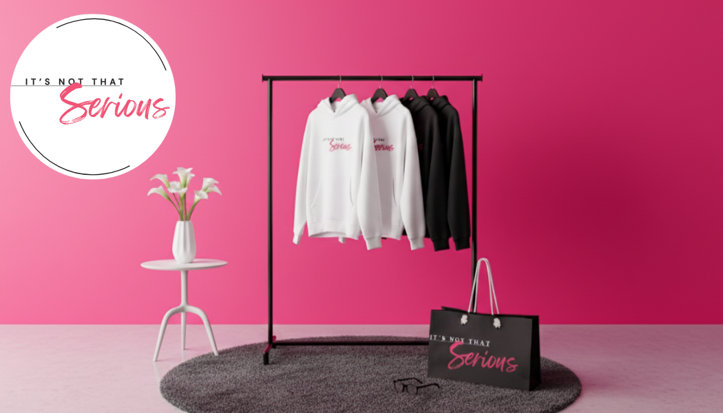 Women in a white It's Not That Serious logo hoodie with a branded weekender bag with a hot pink feather background